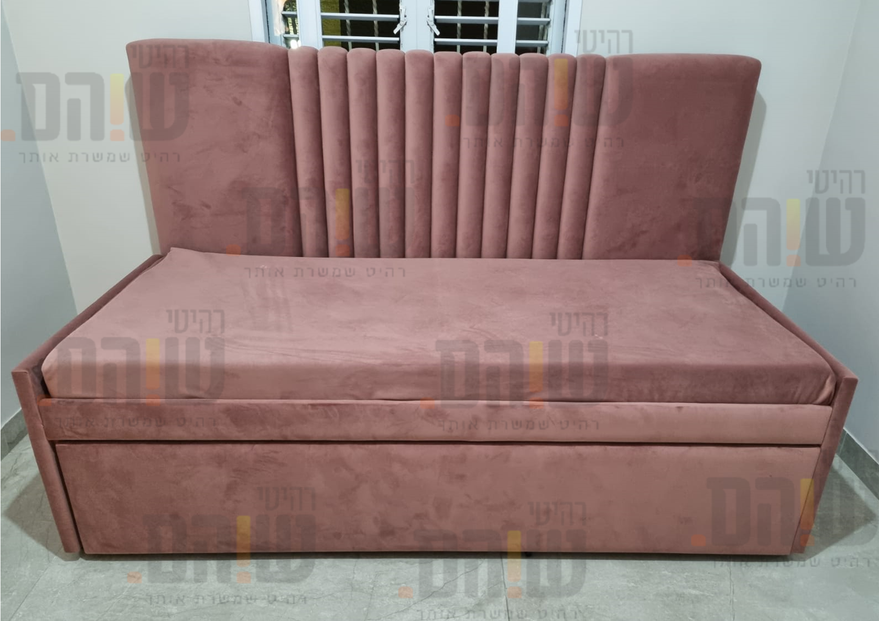 מיטת נוער מרופדת מודרנית בבד קטיפתי עם ראש מיטה מעוגל בעיצוב ייחודי בגוון וורוד אפרסקי