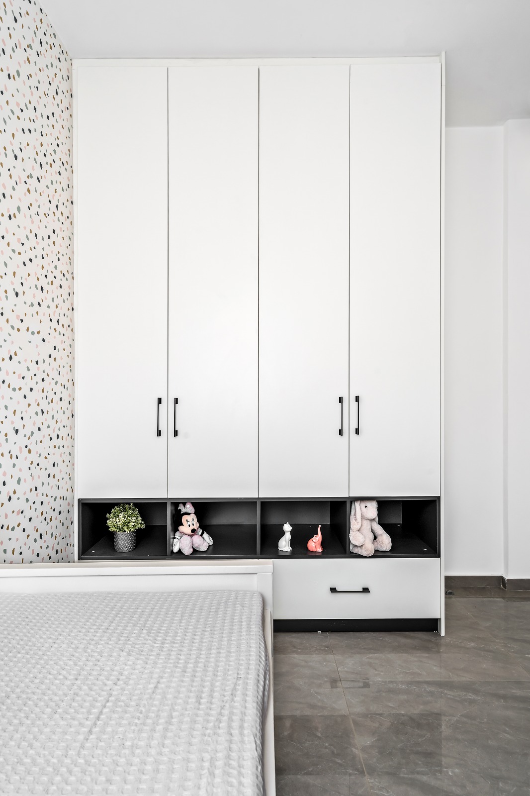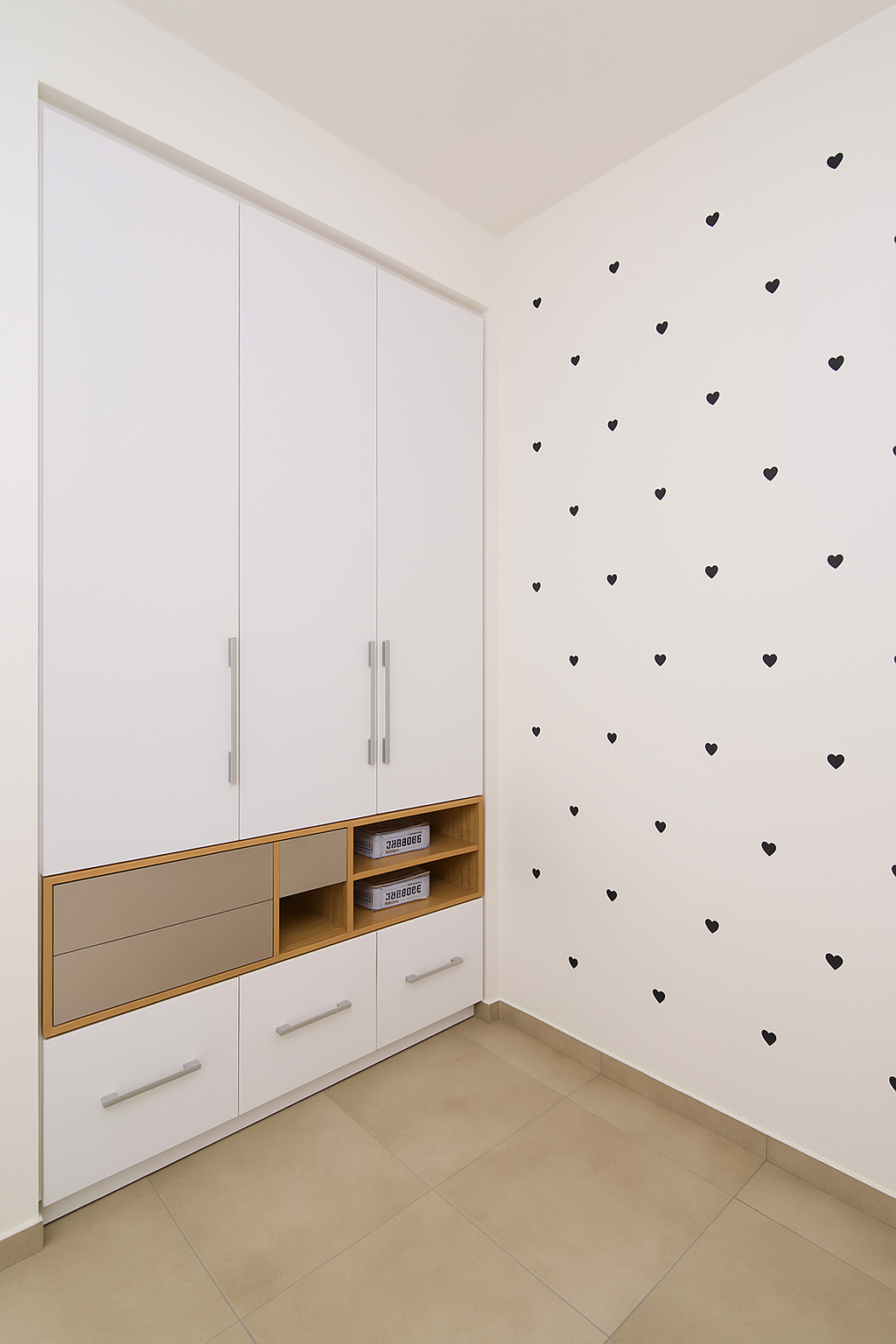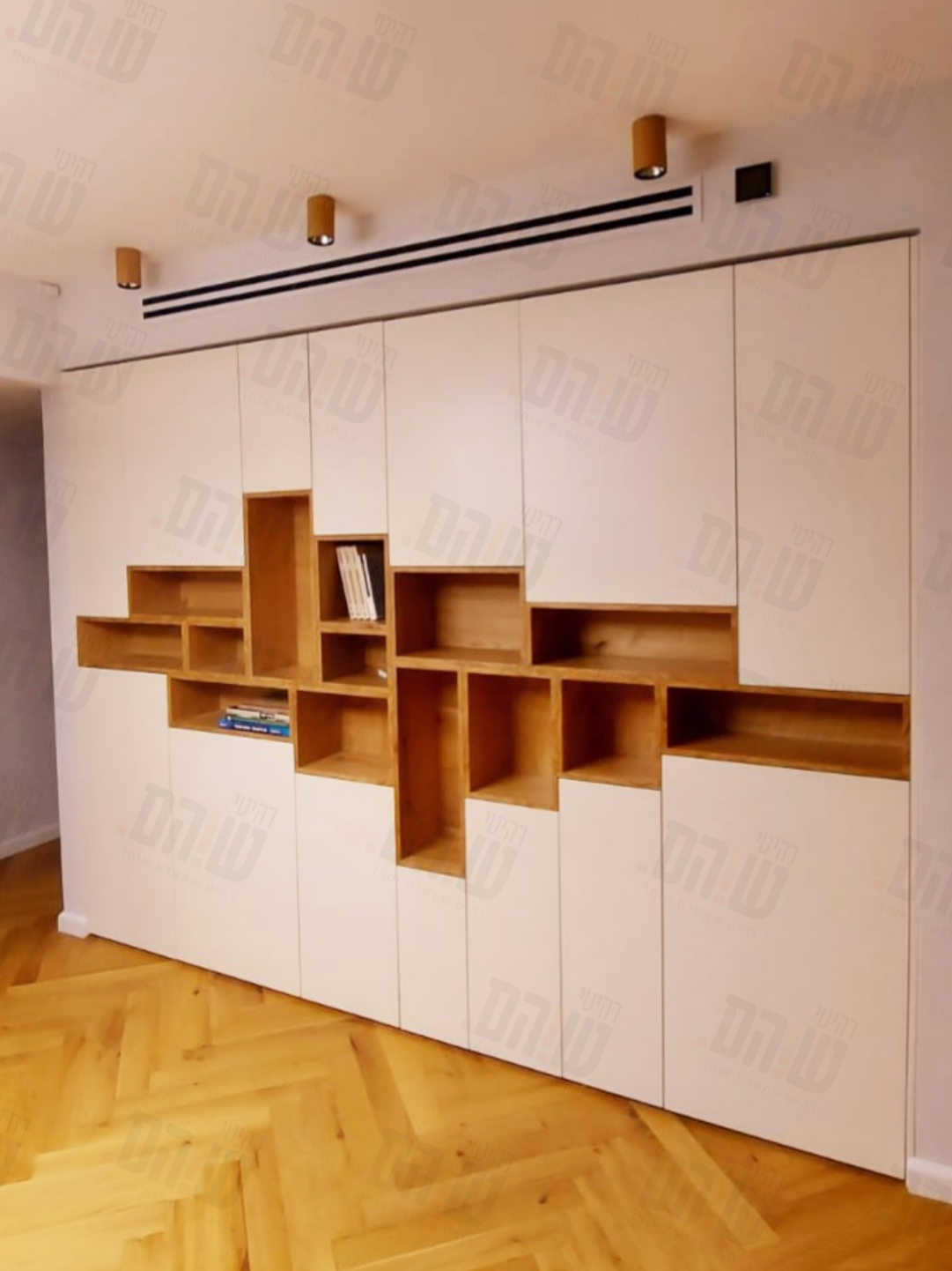 ארון בגדים עם חזית בהירה בקווים נקיים, משולב נישות פתוחות בגימור עץ, מגירות תחתונות וידיות כהות.