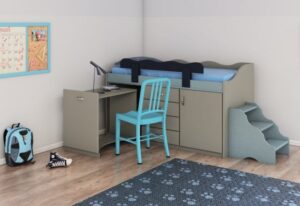 חדר ילדים צעיר עם מיטה מוגבהת ושולחן עבודה משולב
